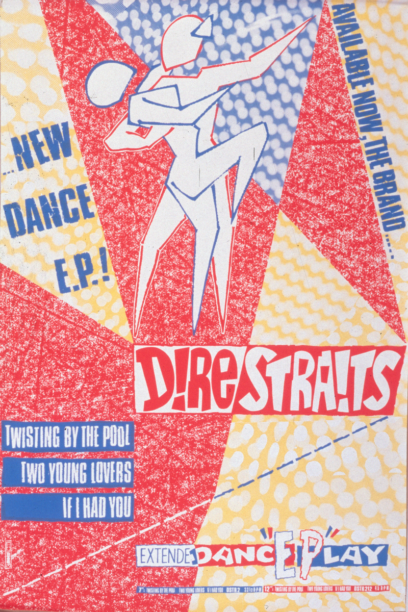 ...Mark Knopfler asked me to give Dire Straits a new, noticeably different look - both for the covers and a logo and to avoid photography and particularly photos of the band - he liked the illustrative stuff I'd done at Stiff and for The Theatre of Hate and some recent freelance 'c-more-tone studios' covers & posters for Dave Edmunds and the Stray Cats...