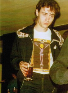 …this photo from around 1980 was probably taken at the Hope & Anchor but definitely on the way from the bar to see a band play - it features one of my all time favourite T-shirts; it was done by The Residents and has a smiley face stuck on a framed pic of Jesus on the cross with the title ‘Buy or Die’…