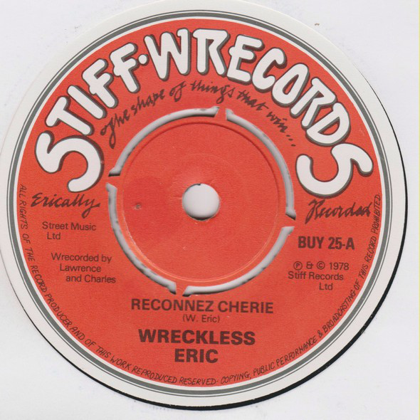 The special 'wrecord' label for Wreckless I did was inspired by my love of puns and the 'world on a plate' Stiff logo (on the back cover...) that i'd done for the Stif Shop carrier bags - which was in turn inspired by Eric's imestimable Whole Wide World single...