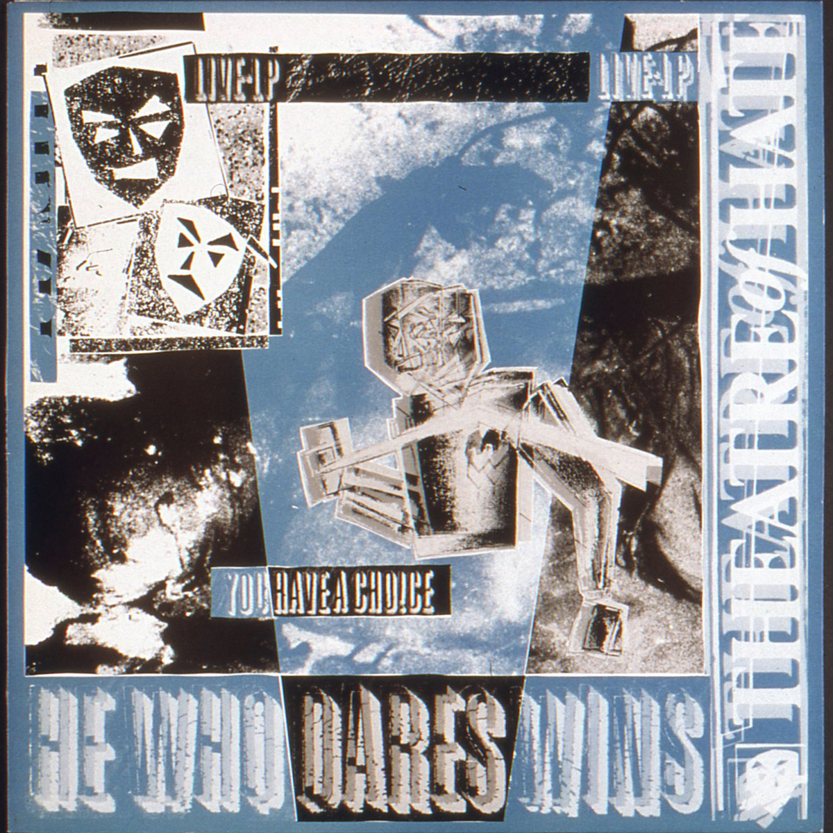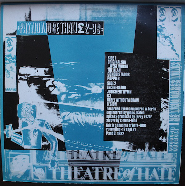 …this is a good example of what can be achieved when you're allowed the freedom to experiment and develope more & more abstracted & distorted imagery by re-using bits of previous cover designs in amongst newer ones - this was how the hand-drawn central Theatre of Hate illustrated figure from the Westworld LP cover was developed into the more abstracted collaged figure seen here...