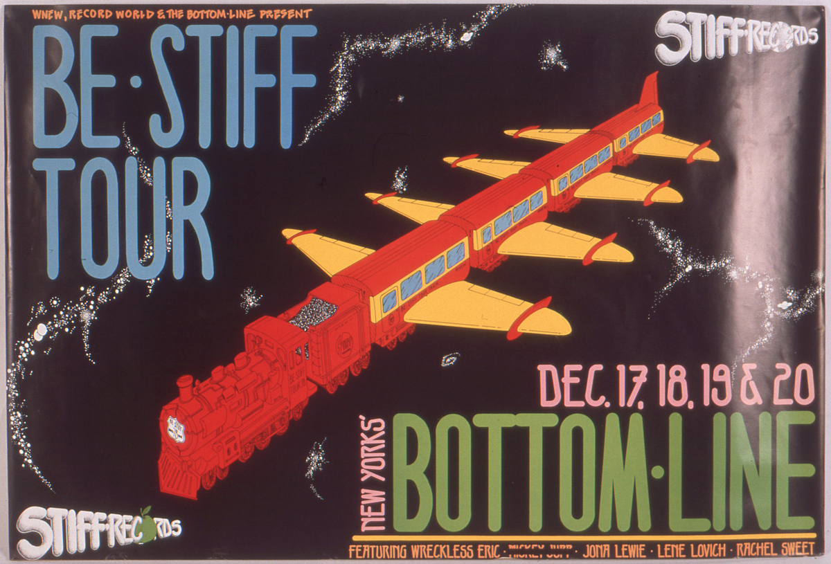 ...Wonderfully, Stiff's boss Dave Robinson took most of the Stiff staff along with the bands & roadies to New York for a week for the Be Stiff Tour's run of dates at the Bottom Line club - leaving behind a bare minimum 'skeleton staff' and the unfortunate Mickey Jupp who couldn't/wouldn't fly...