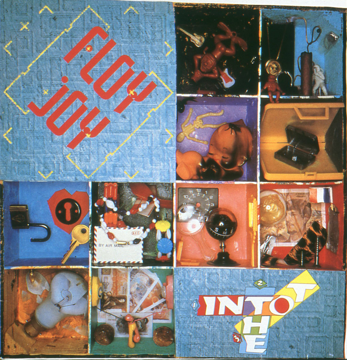 It's an 18" square orange box from a market place, the idea was that it was compartmentalised, with each section representing a track from the album. It's 3D sculptural collage - like a doll's house, but made of things that might be teenager's leftovers. They are all cheap, ephemeral plastic toys as you would get from a newsagents or sweet shop...